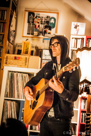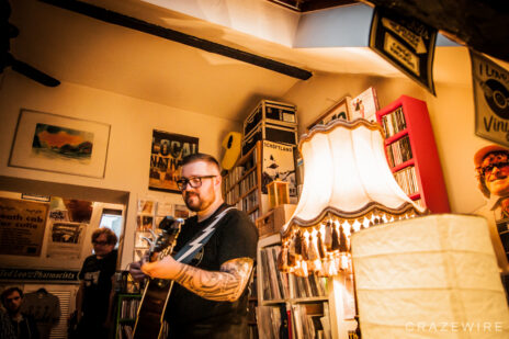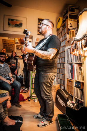 Eine erlesene Schar von ca. 20 Zuhörern versammelt sich in einer verwinkelten Dachgeschosswohnung, die eingerichtet ist wie ein Plattenladen. Man fläzt auf Sofas und Matratzen und schaut durch überdimensionale Dachfenster in den Himmel über der Bonner Altstadt.